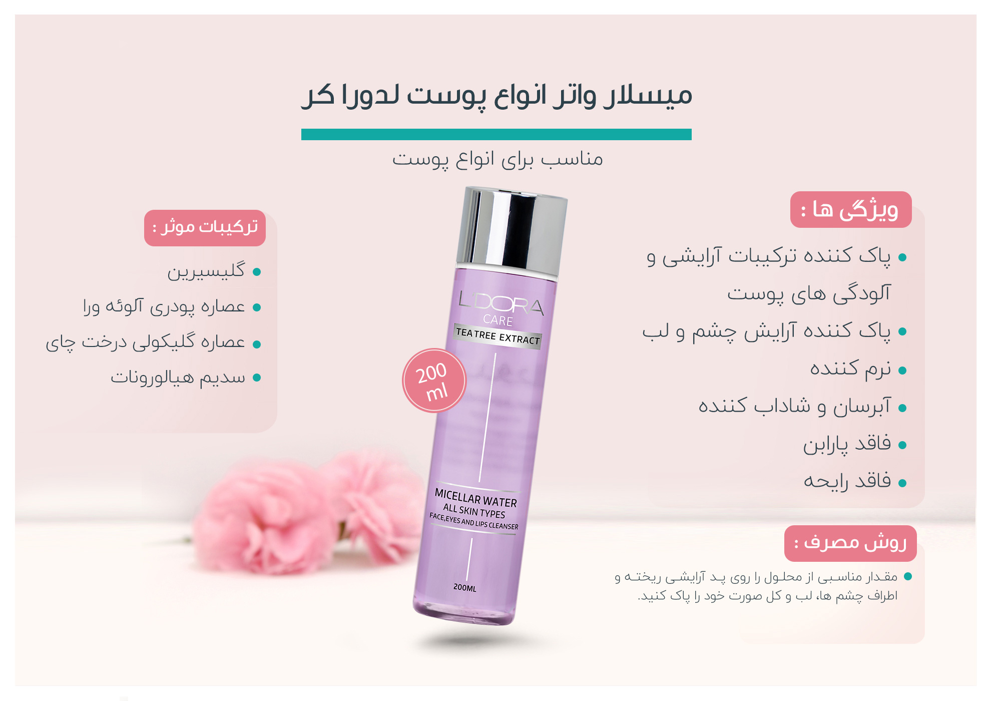 ترکیبات موثر: گلیسیرین، عصاره پودری آلوئهورا، عصاره گلیکولی درخت چای، سدیم هیالورونات