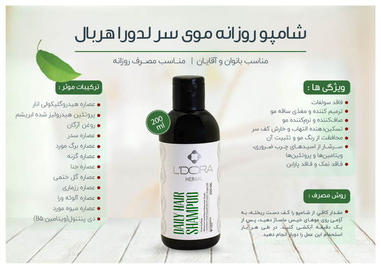 ترکیبات موثر: عصاره هیدروگلیکولی انار، پروتئین هیدرولیز شده ابریشم، روغن آرگان، عصاره سدر، عصاره برگ مورد، عصاره گزنه، عصاره حنا، عصاره گل ختمی، عصاره رزماری، عصاره آلوئهورا، عصاره میوه مورد، دیپنتنول (پرو ویتامین B5)