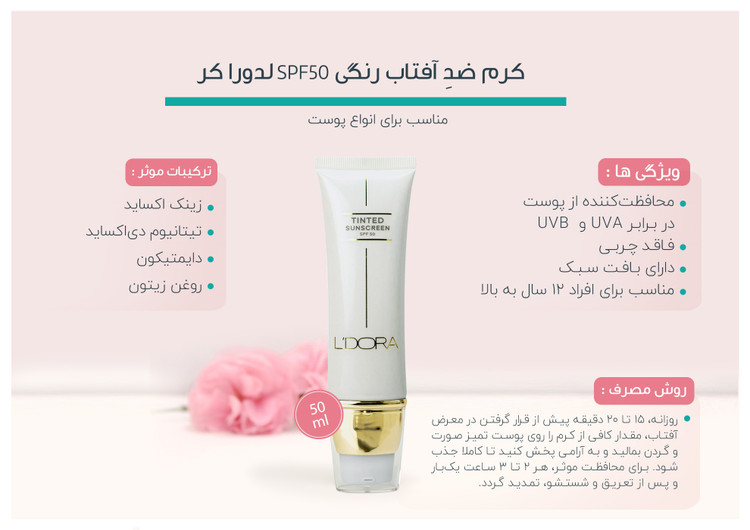 کرم ضدآفتاب رنگی SPF50 لدورا با ترکیبی از فیلترهای فیزیکی و شیمیایی، محافظی قدرتمند در برابر پرتوهای مضرآفتاب است.