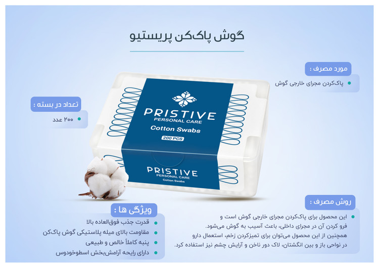 ویژگی ها: قدرت جذب فوقالعاده بالا، مقاومت بالای میله پلاستیکی گوش پاککن، پنبه کاملاً خالص و طبیعی، دارای رایحه آرامشبخش اسطوخودوس